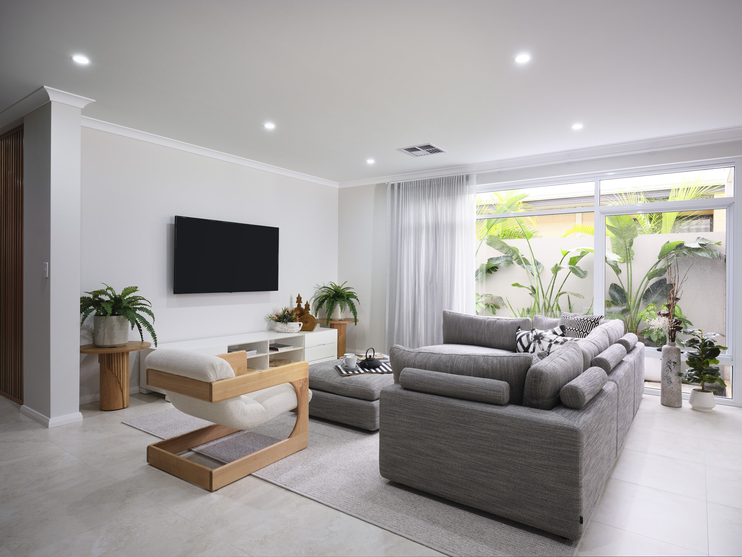 Affordable Living Homes proudly presents The Villa – A stunning new display home designed for modern family living in the vibrant community of Treeby. This beautifully crafted home features a distinctive arch elevation with eye-catching feature cladding and a wide 1000mm aluminium front door that sets the tone for stylish, welcoming living. The Villa offers four spacious bedrooms, with built-in sliding robes to minor bedrooms, plus two full bathrooms and a convenient powder room, providing ample space and privacy for the whole family. The resort-inspired master ensuite is a true highlight, boasting a freestanding bath, double shower, and double basins, offering a luxurious retreat right at home. The open plan layout features a dedicated theatre room for entertainment, while the modern kitchen impresses with stainless steel appliances, 20mm stone benchtops and a standout feature is the bifold window that seamlessly connects the kitchen to the alfresco area, perfect for indoor-outdoor living and entertaining. The Villa combines style and comfort making it an ideal choice for families seeking quality family time.